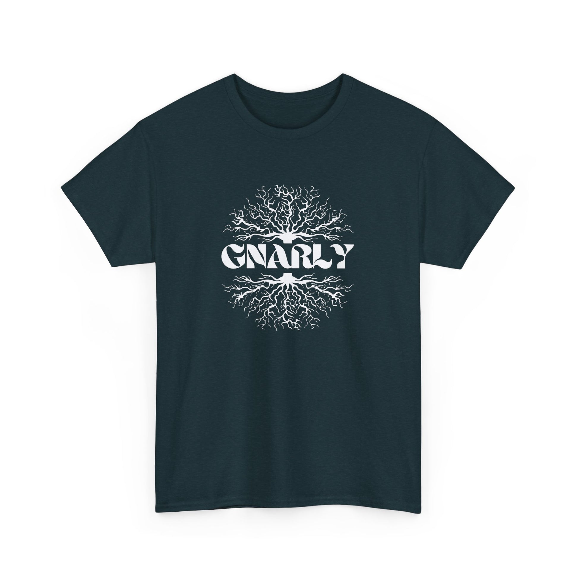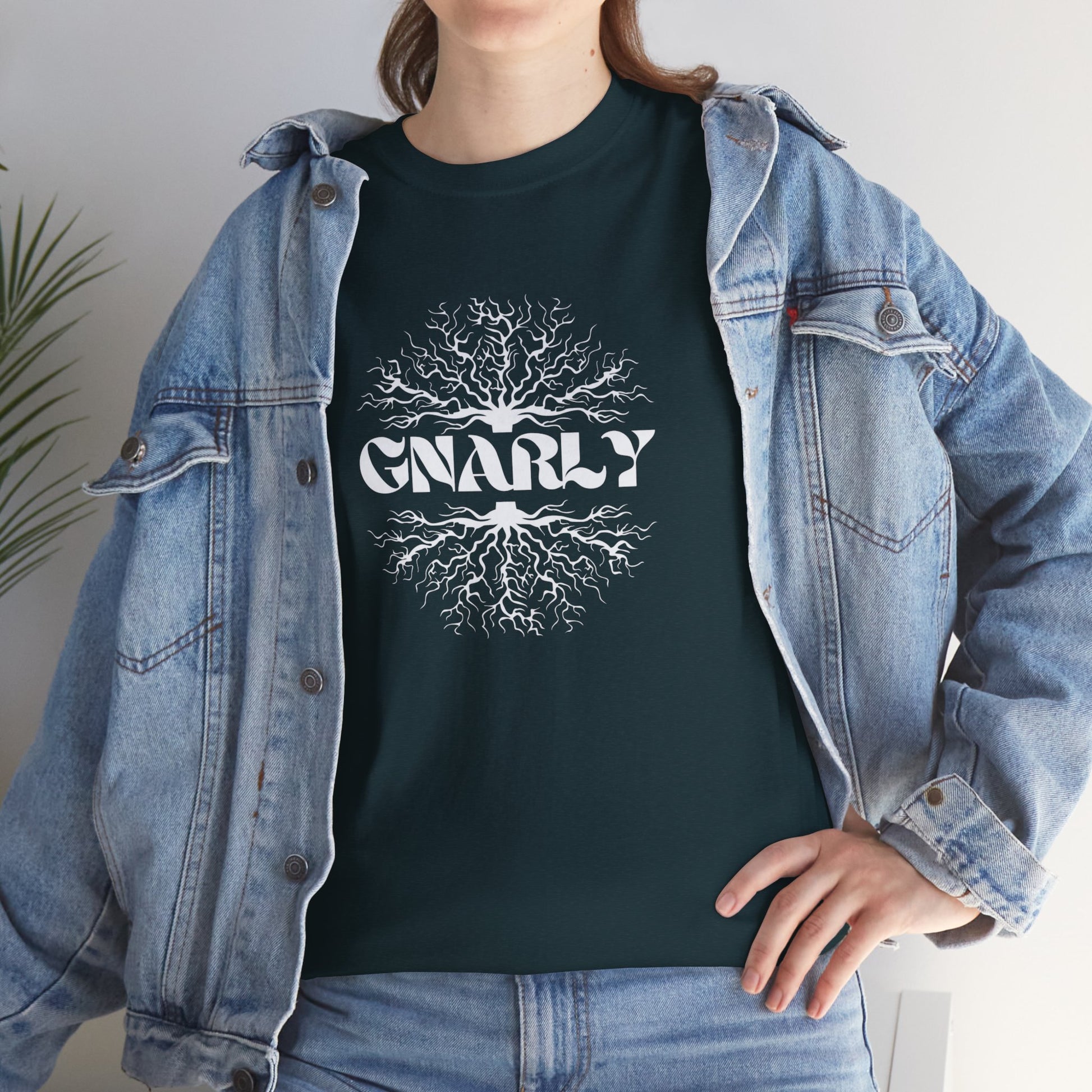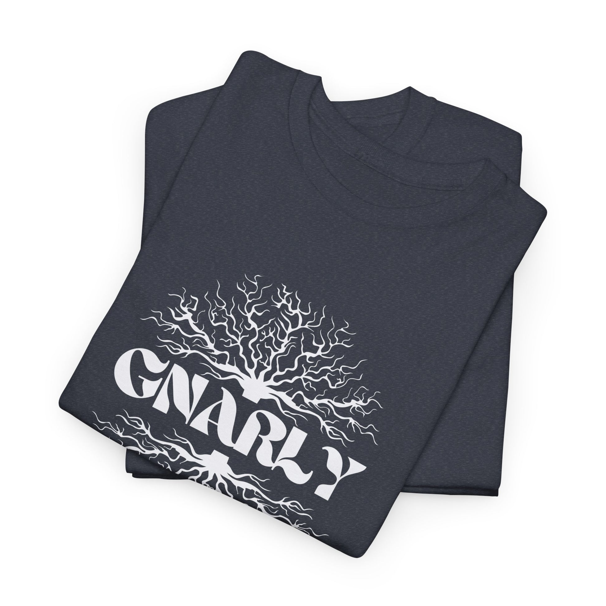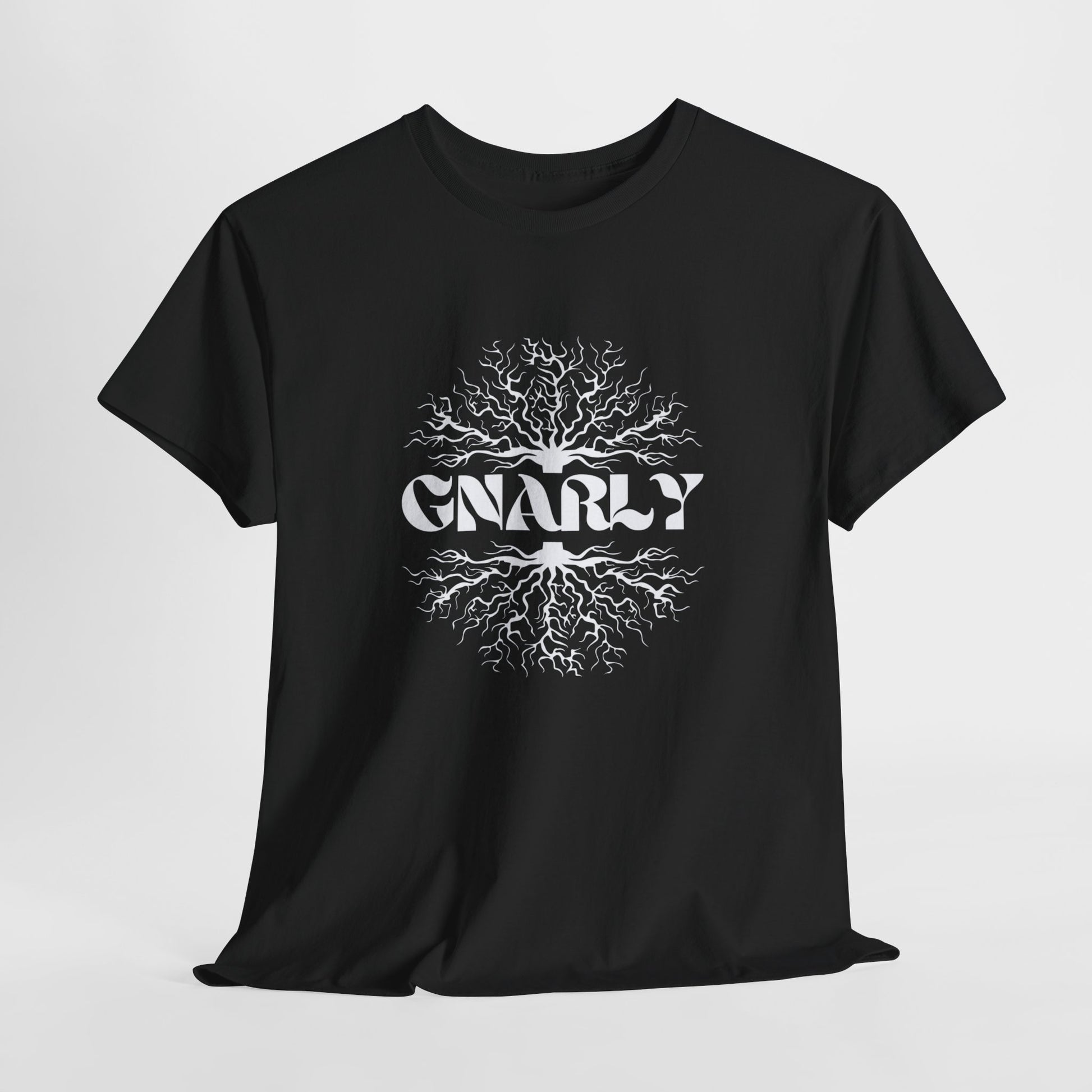 • Bold 80s-inspired “Gnarly” graphic with branch + root linework symbolizing a grounded core of cool