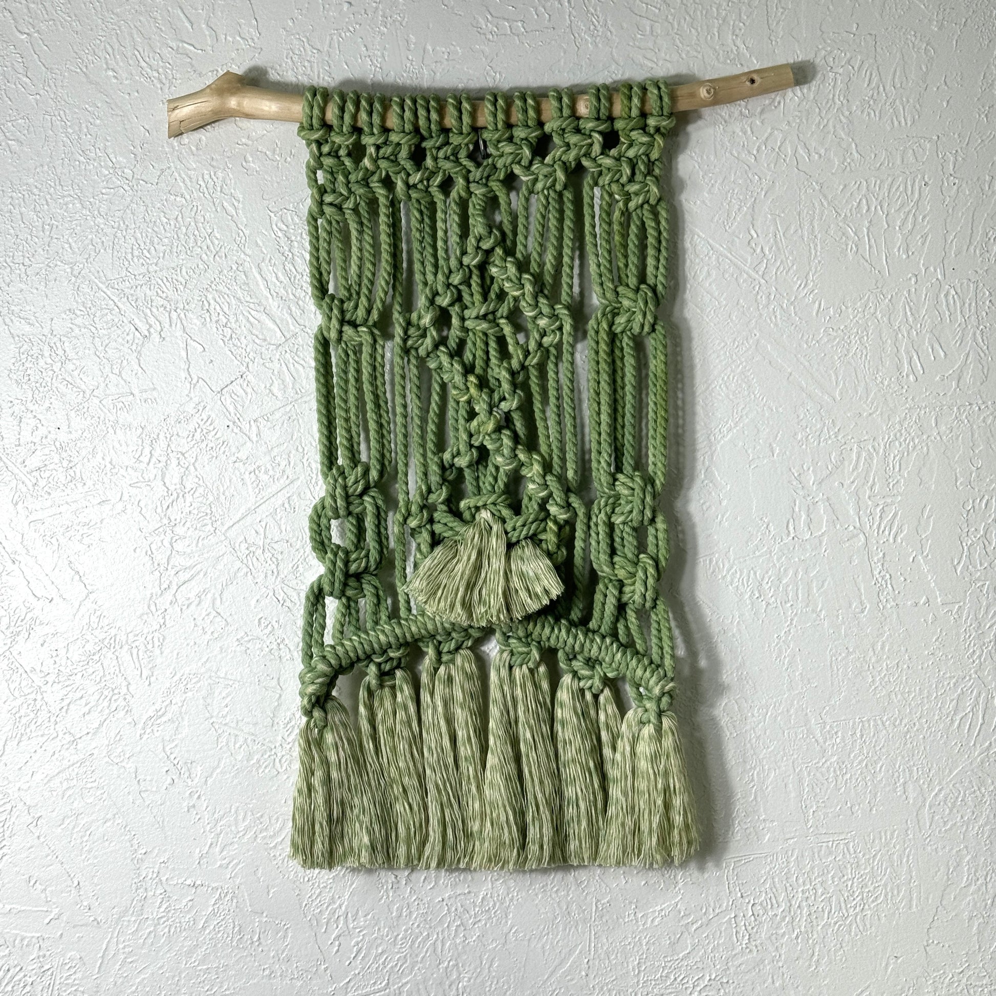 Enhance your indoor or outdoor space with this Macrame creation made from durable poly rope. Admire the elegant chain links and diamond blocks, adorned with hues of green that perfectly complement nature-inspired settings. Its compact size makes it perfect for smaller spaces, while the resilient poly cord makes it suitable for all weather conditions. A great addition to any bathroom, this piece is also a thoughtful gift for someone special.