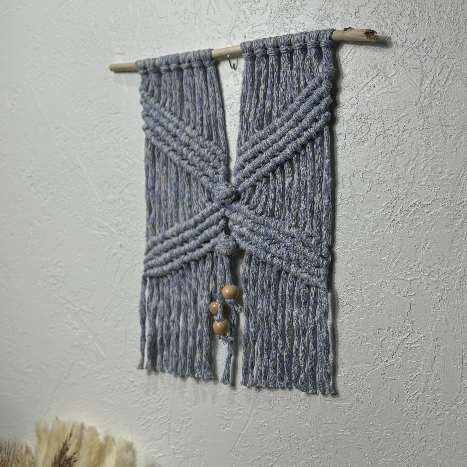 Transform any nursery with this beautiful macrame design in soothing baby blue. Crafted from recycled cord, it adds a pop of color to any wall. Embrace simplicity and tranquility with its soft blue tones that perfectly complement any decor. Compact and versatile, it's a must-have addition to any space. Ideal as a baby shower gift too!